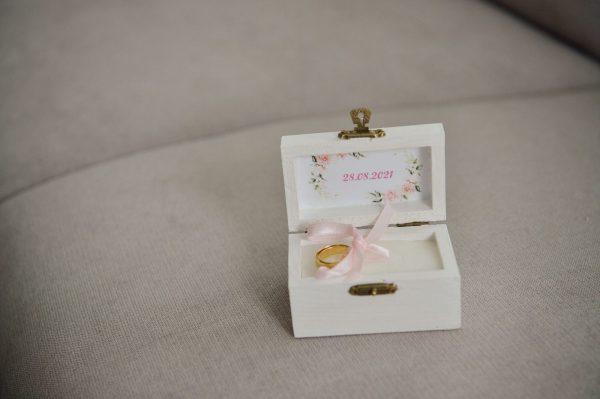 Cutiuța de lemn pentru verighetele de nunta este decorată cu tehnica decoupage și se poate personaliza cu numele mirilor/inițialele mirilor/data,etc.