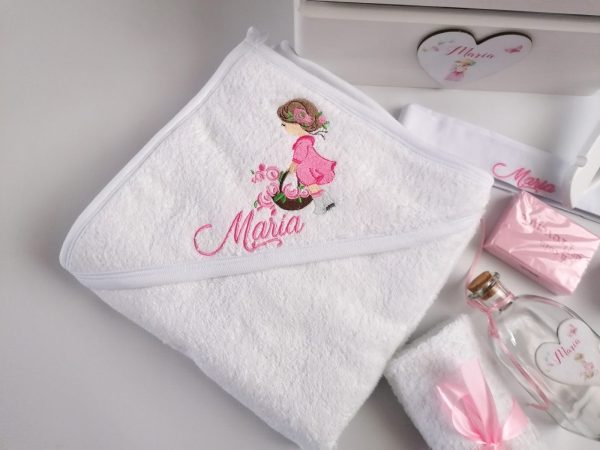 - prosop cu capișon din bumbac 100%,un element esențial în trusoul de botez, special conceput pentru a oferi confort și căldură bebelușului după ceremonia botezului. Acest prosop cu capișon are dimensiunile potrivite de 80/100 cm garantând o textură moale și plăcută la atingere. Este prevăzut cu un capișon, asigurând astfel o uscare optimă a părului și a capului bebelușului. Prosopul este brodat cu o imagine tematică a botezului, adăugând un element simbolic și frumos acestui produs. De asemenea, este personalizat cu numele bebelușului, transformându-l într-un suvenir special și personalizat al acestui eveniment sacru. Acest prosop cu capișon devine astfel un cadou minunat pentru bebeluș și o amintire deosebită a zilei botezului, aducând bucurie și emoție în viața micuțului și a familiei sale