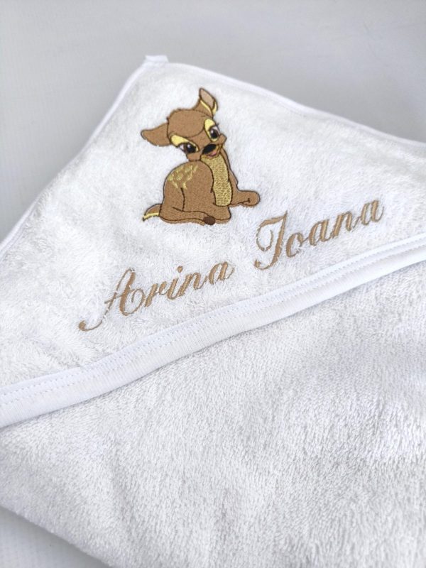 • prosop cu capișon din bumbac 100%,un element esențial în trusoul de botez, special conceput pentru a oferi confort și căldură bebelușului după ceremonia botezului. Acest prosop cu capișon are dimensiunile potrivite de 80/100 cm  garantând o textură moale și plăcută la atingere. Este prevăzut cu un capișon, asigurând astfel o uscare optimă a părului și a capului bebelușului. Prosopul este brodat cu o imagine tematică a botezului, adăugând un element simbolic și frumos acestui produs. De asemenea, este personalizat cu numele bebelușului, transformându-l într-un suvenir special și personalizat al acestui eveniment sacru. Acest prosop cu capișon devine astfel un cadou minunat pentru bebeluș și o amintire deosebită a zilei botezului, aducând bucurie și emoție în viața micuțului și a familiei sale