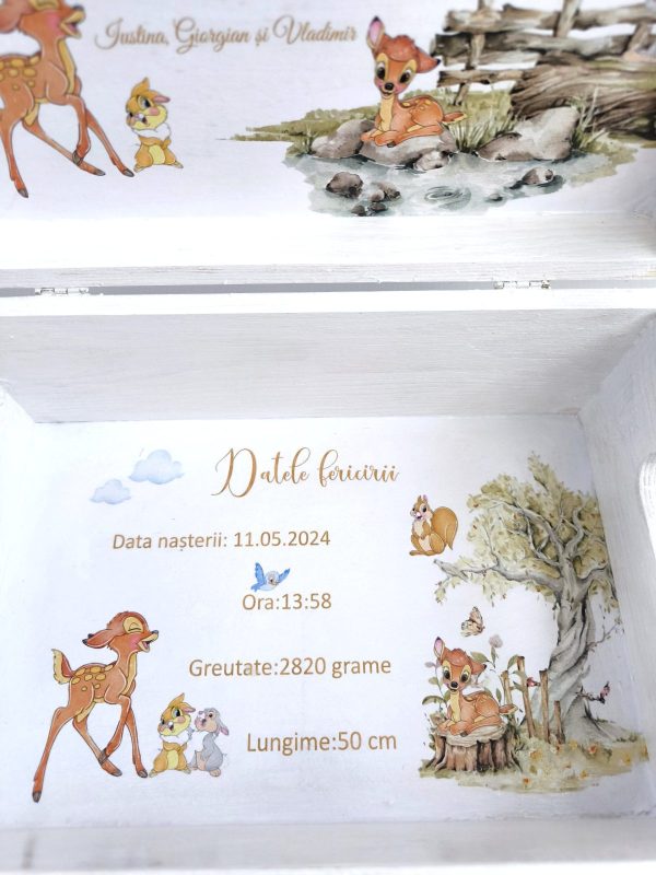 • cutie amintiri din lemn. Cutia de amintiri poate fi folosită de părinți pentru a aduna amintiri din timpul botezului( fotografii, hainuțe, pantofi, cutia cu șuvița de păr) sau orice alt obiect cu valoare sentimentală