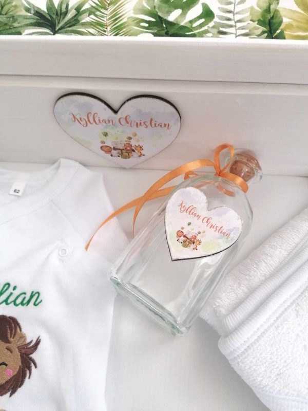 • sticluța de mir personalizată cu o inimioara din lemn si o panglică. În timpul slujbei, înainte de scufundarea în cristelniță, cel mic trebuie uns cu mir, pe frunte, pe piept, mâini și picioare. După slujbă, mirul se ia acasă și se păstrează într-o sticluță până a doua zi când este folosit la îmbăiere.