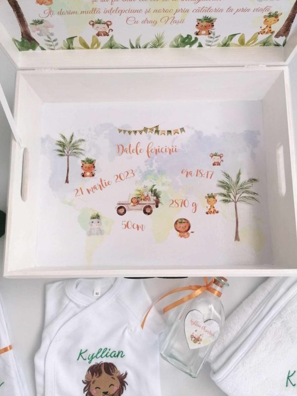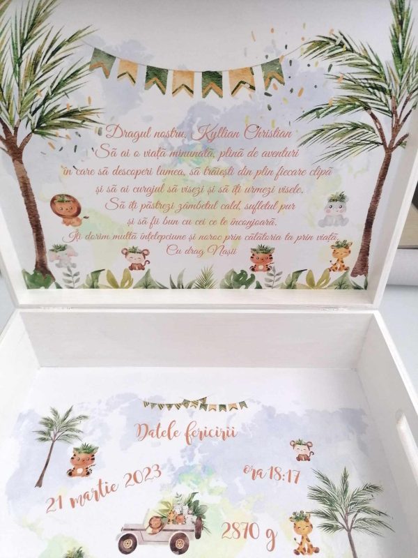 • cutie amintiri din lemn. Cutia de amintiri poate fi folosită de părinți pentru a aduna amintiri din timpul botezului( fotografii, hainuțe, pantofi, cutia cu șuvița de păr) sau orice alt obiect cu valoare sentimentală