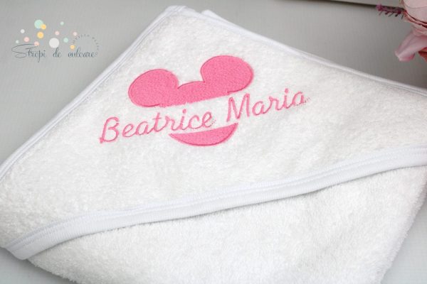 - prosop cu capișon din bumbac 100%,un element esențial în trusoul de botez, special conceput pentru a oferi confort și căldură bebelușului după ceremonia botezului. Acest prosop cu capișon are dimensiunile potrivite de 80/100 cm garantând o textură moale și plăcută la atingere. Este prevăzut cu un capișon, asigurând astfel o uscare optimă a părului și a capului bebelușului. Prosopul este brodat cu o imagine tematică a botezului, adăugând un element simbolic și frumos acestui produs. De asemenea, este personalizat cu numele bebelușului, transformându-l într-un suvenir special și personalizat al acestui eveniment sacru. Acest prosop cu capișon devine astfel un cadou minunat pentru bebeluș și o amintire deosebită a zilei botezului, aducând bucurie și emoție în viața micuțului și a familiei sale