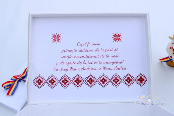 - cutie amintiri din lemn. Cutia de amintiri poate fi folosită de părinți pentru a aduna amintiri din timpul botezului( fotografii, hainuțe, pantofi, cutia cu șuvița de păr) sau orice alt obiect cu valoare sentimentală