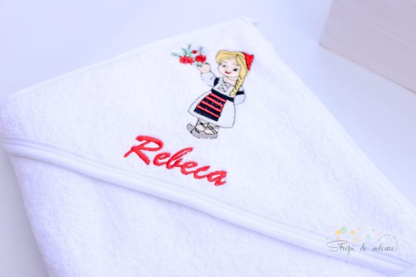 - prosop cu capișon din bumbac 100%,un element esențial în trusoul de botez, special conceput pentru a oferi confort și căldură bebelușului după ceremonia botezului. Acest prosop cu capișon are dimensiunile potrivite de 80/100 cm garantând o textură moale și plăcută la atingere. Este prevăzut cu un capișon, asigurând astfel o uscare optimă a părului și a capului bebelușului. Prosopul este brodat cu o imagine tematică a botezului, adăugând un element simbolic și frumos acestui produs. De asemenea, este personalizat cu numele bebelușului, transformându-l într-un suvenir special și personalizat al acestui eveniment sacru. Acest prosop cu capișon devine astfel un cadou minunat pentru bebeluș și o amintire deosebită a zilei botezului, aducând bucurie și emoție în viața micuțului și a familiei sale