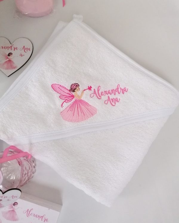 - prosop cu capișon din bumbac 100%,un element esențial în trusoul de botez, special conceput pentru a oferi confort și căldură bebelușului după ceremonia botezului. Acest prosop cu capișon are dimensiunile potrivite de 80/100 cm garantând o textură moale și plăcută la atingere. Este prevăzut cu un capișon, asigurând astfel o uscare optimă a părului și a capului bebelușului. Prosopul este brodat cu o imagine tematică a botezului, adăugând un element simbolic și frumos acestui produs. De asemenea, este personalizat cu numele bebelușului, transformându-l într-un suvenir special și personalizat al acestui eveniment sacru. Acest prosop cu capișon devine astfel un cadou minunat pentru bebeluș și o amintire deosebită a zilei botezului, aducând bucurie și emoție în viața micuțului și a familiei sale